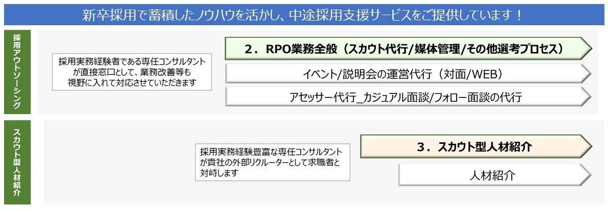 ■採用アウトソーシングの料金に関しましては、担当に確認下さい。 ■スカウト型人材紹介で利用するスカウトサイトに関しましては、別途お打合せの上決定させていただきます。 ■初期費用とスカウトサイトのアカウント利用料は、お申込み月の月末ご請求、翌月末のお支払いとなります。 ■スカウト型人材紹介の手数料は媒体費用により料率が変動しますので、担当にご確認下さい。 ■スカウト型人材紹介の手数料に関する返金規定がございます。 フォームからのお問い合わせはコチラ